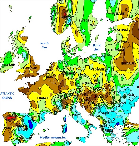 Écart aux normales des températures et précipitations pour l'Europe occidentale.