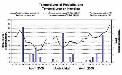 Après avoir connu un temps agréable, doux et sec en début de mois, les conditions sont devenues progressivement plus froides et pluvieuses ensuite. La fin de la première décade a enregistré les températures les plus basses de ce mois : ce furent souvent des températures légèrement négatives en de nombreuses régions du pays. Après quelques jours de températures à nouveau plus douces, la fraîcheur, la pluie et l'humidité nous sont revenues : le brouillard fut aussi souvent présent aux environs du 15 avril.