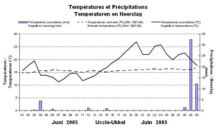 Avec l'arrivée de courants continentaux dès le 17 juin, le pays a connu une vague de chaleur jusqu'au 29 juin, avec des maxima supérieurs à 25°C (excepté le 26) et 4 jours caniculaires, maxima supérieurs à 30°C. La température maximale observée a été de 32.9°C, le 20 juin (Uccle).