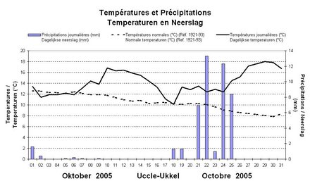 Mais l'arrivée de l'air subtropical en fin de mois ne fut pas prévue avec comme conséquence le retour du soleil et la fin du temps fort perturbé qui nous avait influencé depuis une semaine. Les températures ont ainsi atteint des valeurs records pour cette période de l'année et l'insolation fut aussi particulièrement généreuse, alors que la pluie fut absente ces derniers jours d'octobre 2005...
