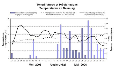 Froid ? Dans la dernière décade, certainement, même si ce froid ne fut pas excessif pour une fin de mois de mai. La chaleur du début du mois, elle, fut nettement plus remarquable : la température moyenne de la première décade fut même exceptionnelle. Ce qui eut comme conséquence une température moyenne sur le mois de 1.5° d'excédent.