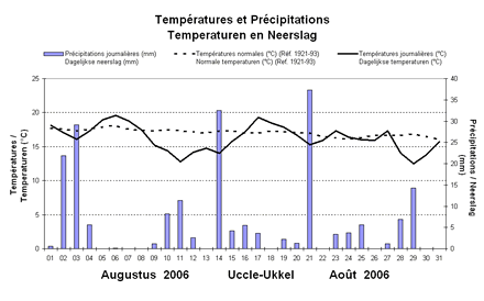En résumé, ce mois d'août 2006, sous influence continue de courants maritimes, aura été fort sombre puisque seulement 94h30 d'insolation aura été mesuré à Uccle, ce qui est la valeur la plus basse jamais enregistrée depuis 1833. Le cumul des précipitations observé est aussi exceptionnel, puisque, depuis 1887 - année du début des mesures des précipitations à Uccle - seule l'année 1996 aura connu une valeur plus importante. La température moyenne, certe plus fraîche que la normale, reste cependant dans les normales saisonnières.