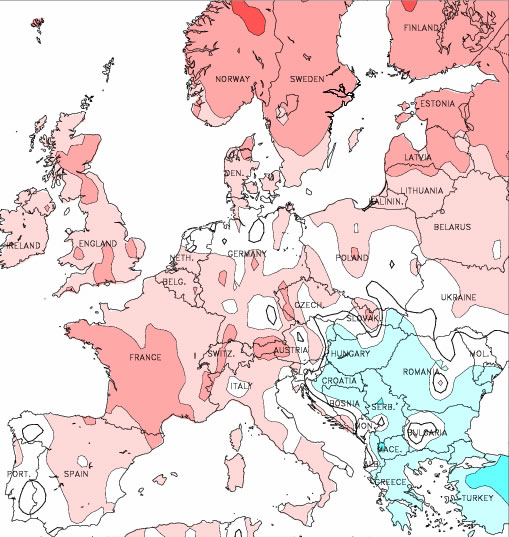Le cas de Bruxelles a été intéressant aussi. Au sud de la ville, à Uccle, le temps a été très beau et la température maximale est montée jusqu'à 13,7°C. Au nord-est de la ville par contre, à l'aéroport de Zaventem, le brouillard n'a pas réussi à se dissiper et le maximum n'a pas dépassé 6,0°C.
