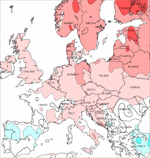 Écart aux normales des températures et précipitations pour l'Europe occidentale.