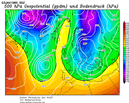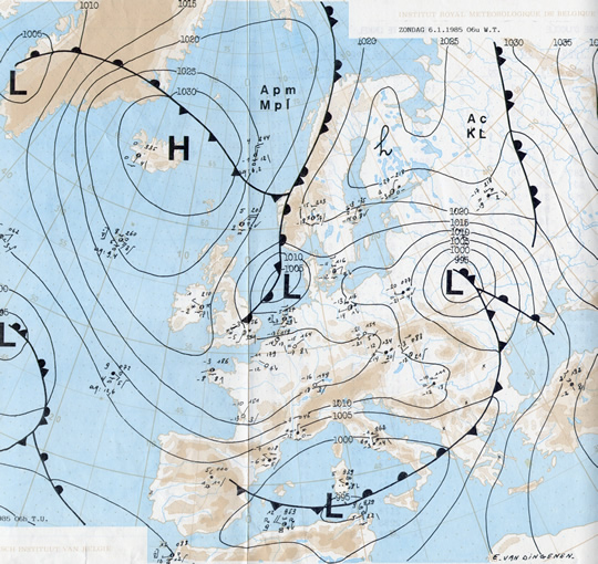La dépression, à présent située sur la République Démocratique Allemande (eh oui, ça existait encore en 1985), nous envoie un nouveau front froid, mais affaibli. Il est suivi d’air polaire continental, se chargeant d’humidité après un détour sur la Mer du Nord.