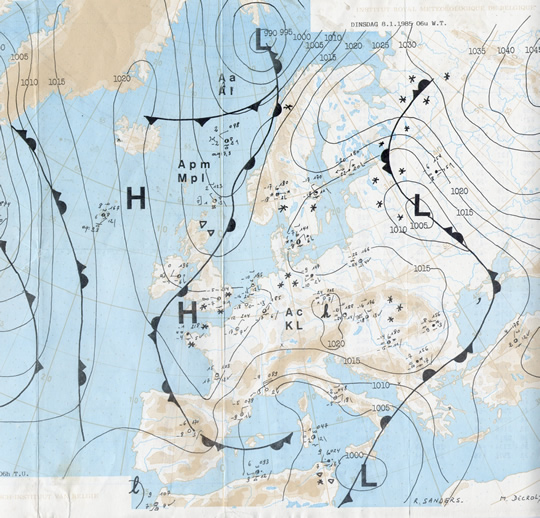 Dans les semaines qui suivent, les températures baissent certes un peu, mais l’on peut toujours parler d’un « petit » temps hivernal doux et bien belge, avec une circulation d’ouest tantôt teintée de hautes pressions, tantôt influencée par des basses pressions avec le passage de perturbations actives. Le gel se fait attendre. À certains endroits, comme à Uccle, la première gelée de la saison hivernale ne se produira que le 29 décembre, et d’aucuns se remettent à croire que l’hiver est foutu, que la gelée en question n’est qu’un phénomène isolé, bien vite balayé par la prochaine zone de pluie. Pourtant, la situation atmosphérique générale a bien changé entre-temps. Désormais, les centres d’action ne se déplacent plus d’ouest en est, mais d’est en ouest, préparant le terrain pour l’arrivée d’air de plus en plus froid.