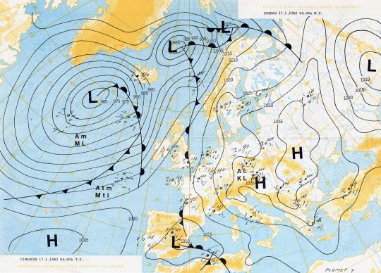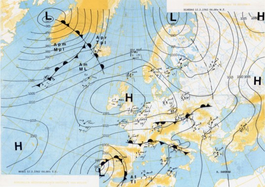 Le flux zonal qui circulait au sud de nos régions se disloque temporairement. Un anticyclone sur la Scandinavie, avec un second noyau sur les îles Britanniques, et une dépression sur l’ouest de la Russie (Union Soviétique à l’époque) deviennent les acteurs principaux pour le temps sur nos régions.