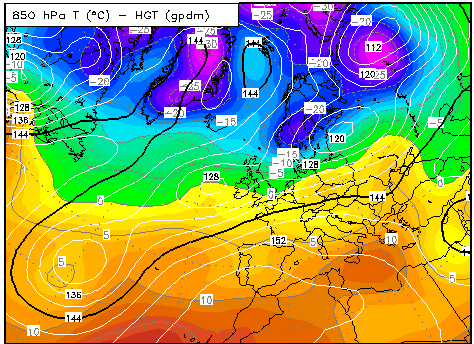 Cette carte des température au niveau 850 hPa illustre quant à elle le transport d'air très froid, d'origine russe, se développant au sein de cette circulation de nord-est. À ce stade, c'est surtout la Scandinavie qui en est concernée.
