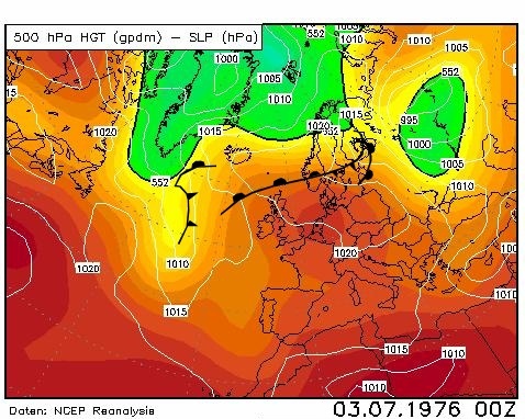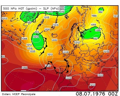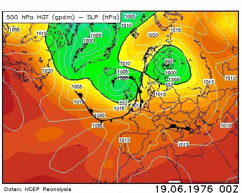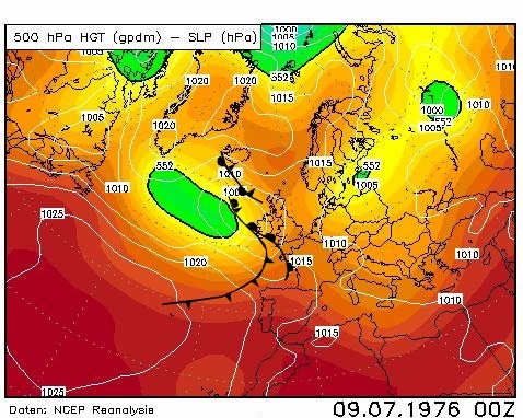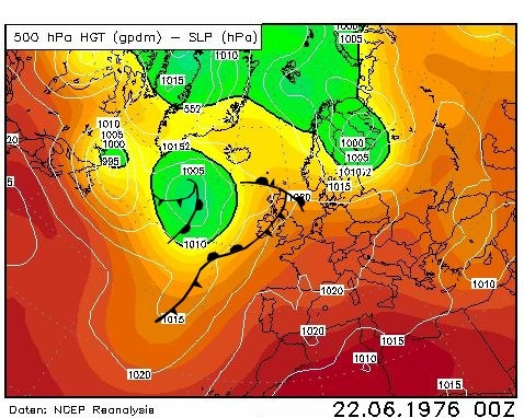 Mais dès le 21, tout change. Les courants perturbés remontent de plus en plus vers le nord tandis que l’anticyclone des Açores pousse de puissantes crêtes vers nos régions, dont se détachent régulièrement de petits anticyclones qui remontent vers le nord-est. En altitude, une crête tout aussi puissante se forme au-dessus de nos contrées, qui se détache par la suite pour former une circulation fermée (high over low). Plus tard, cet anticyclone d’altitude sera à nouveau repris dans une crête, qui formera un blocage « oméga » très stable. Aucune perturbation ne s’approchera désormais de notre pays, c’est le retour d’une sécheresse extrême (sécheresse qui sévit déjà depuis février 1976 et, dans une moindre mesure, depuis octobre 1975) et les températures montent très rapidement.
