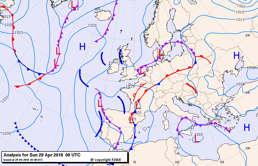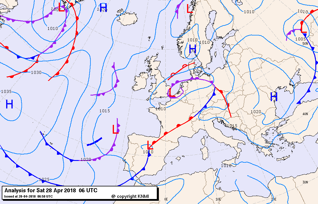 Le 27 avril au matin, une petite dépression sur l’Océan s’apprête à entrer dans la Manche. Elle se trouve à l’entrée de la Manche en milieu de journée et à la sortie (entre Calais et Douvres) durant la nuit du 27 au 28.