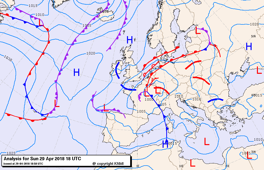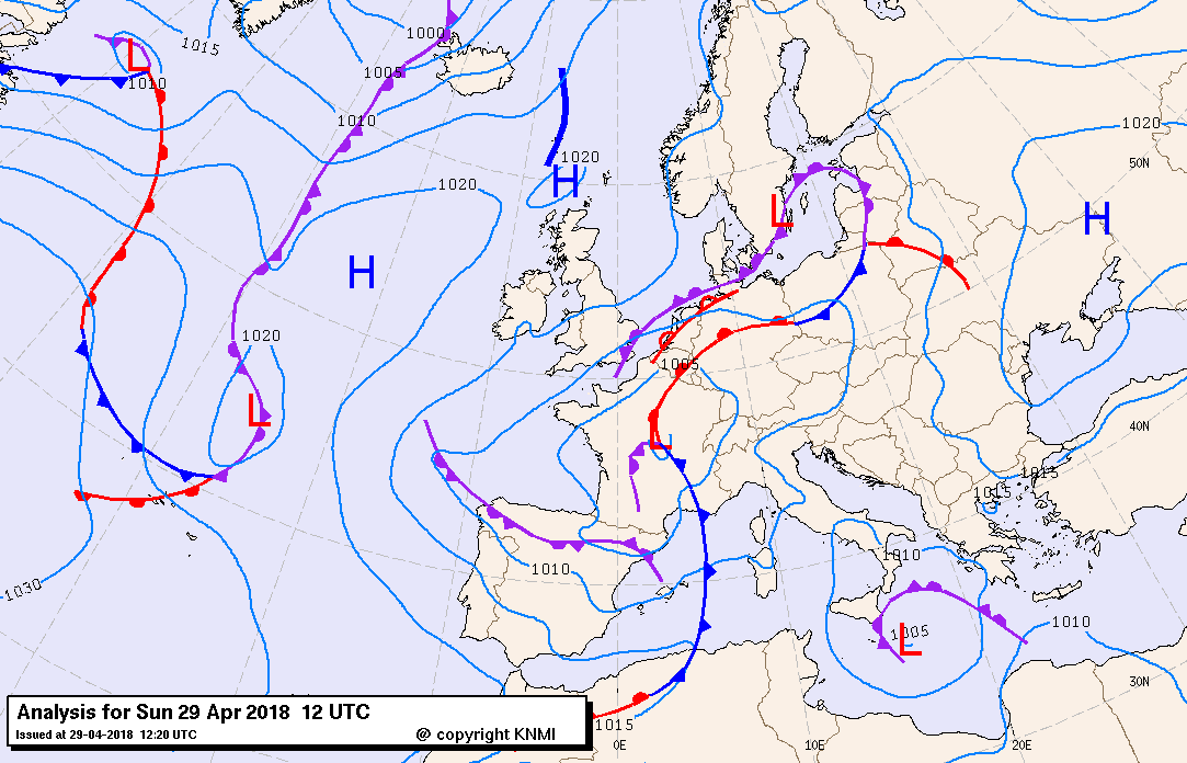 Comme on peut le voir sur la carte aussi, un noyau dépressionnaire s’est formé au sommet du système frontal dont fait partie le front chaud. En même temps, des hautes pressions se dessinent sur l’Océan, ainsi que sur le nord de la Mer du Nord et les côtes de Norvège, ce qui entraîne pour nos régions un flux de nord-est à nord, dans les basses couches tout au moins.