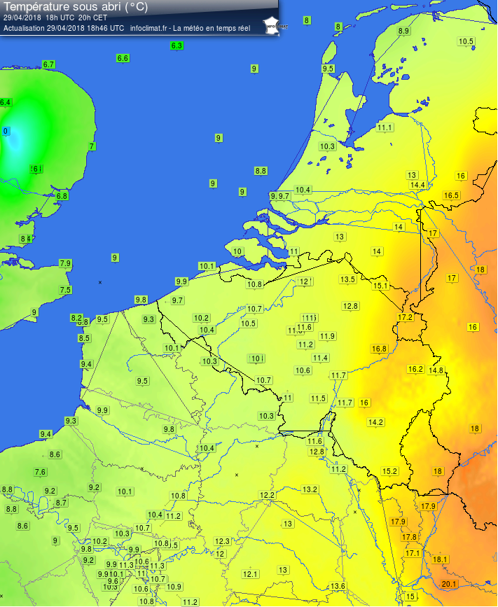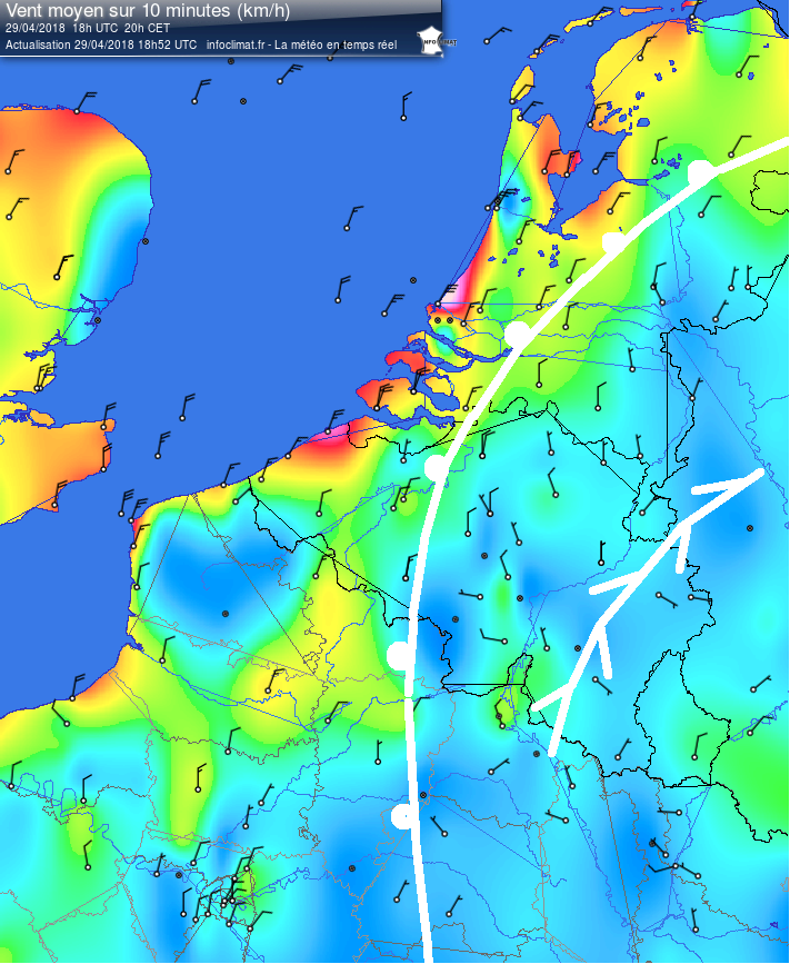 Dans la zone limite, on observe un temps brumeux et couvert en matinée, puis une dissipation partielle ou totale des nuages bas pendant quelques heures en après-midi ou début de soirée, avant l’arrivée des orages. La hausse des températures dépend de la durée des éclaircies. À Beauvechain, on n’enregistre qu’une petite pointe à 13,6°C en fin d’après-midi, tandis que Gorsem, un peu plus à l’est, monte déjà jusqu’à 17,4°C. Mais dans l’ensemble, ces remontées de températures près de la ligne de convergence (qui bouge parfois un peu vers l’ouest) sont anecdotiques, le vrai temps doux ne se manifestant que bien à l’est de ladite ligne de convergence.