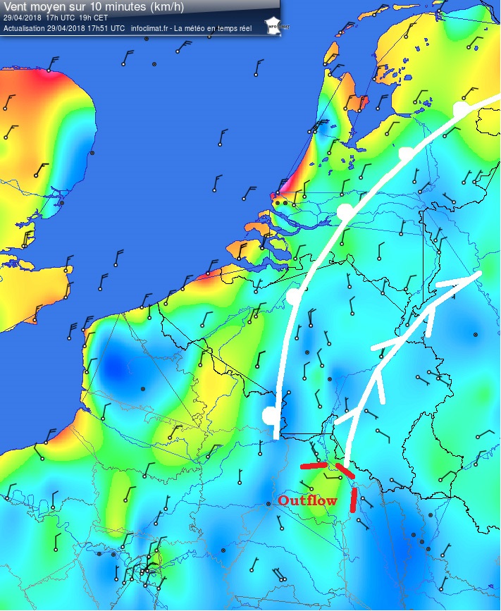 Cette carte indique en plus l’outflow des orages, et nous pouvons constater que ce pseudo-front orageux est quasi perpendiculaire à la ligne de convergence et forme une sorte de « triple point » à l’américaine, mais en miniature. Ceci va particulièrement activer la cellule orageuse formée sur cet outflow, occasionnant des phénomènes particulièrement violents dans la région.