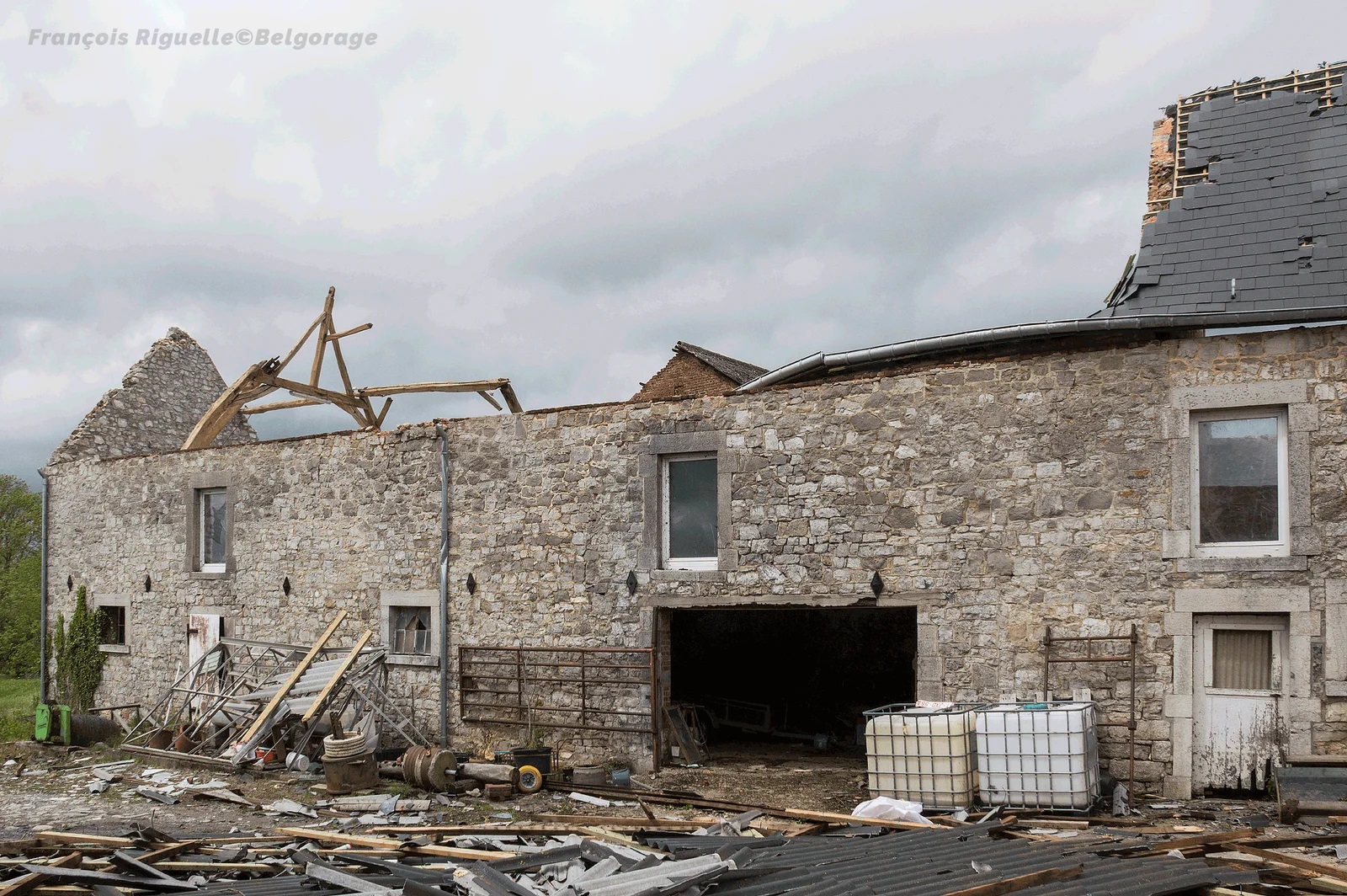 Vue d’ensemble d’une exploitation agricole, située à Waulsort, ayant été endommagée lors du passage d’une tornade d’intensité F2 à son niveau, le 29 avril 2018 vers 20h10