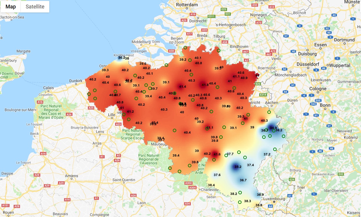 Le 24 juillet 2019 par contre, on y est ! Les premiers 40°C de l’histoire de la Belgique sont atteints à Liège-Angleur, avec 40,2°C. Mais le lendemain, ce sont de grandes parties de notre pays à franchir. Presque toutes nos villes en sont concernées, à commencer par Liège où Angleur enregistre cette fois 41,0°C. À Anvers, on note 40,4°C à l’aéroport de Deurne ; à Bruxelles, ce sont 40,2°C à l’aéroport de Bruxelles-National. À Charleroi, on observe 40,4°C à l’aéroport de Gosselies tandis qu’en région gantoise, on monte jusqu’à 40,4°C à Semmerzake. Et ce ne sont même pas les plus hautes valeurs du pays. À Begijnendijk, on atteint 41,8°C et à Houyet, 41,6°C. C’est tout simplement incroyable !