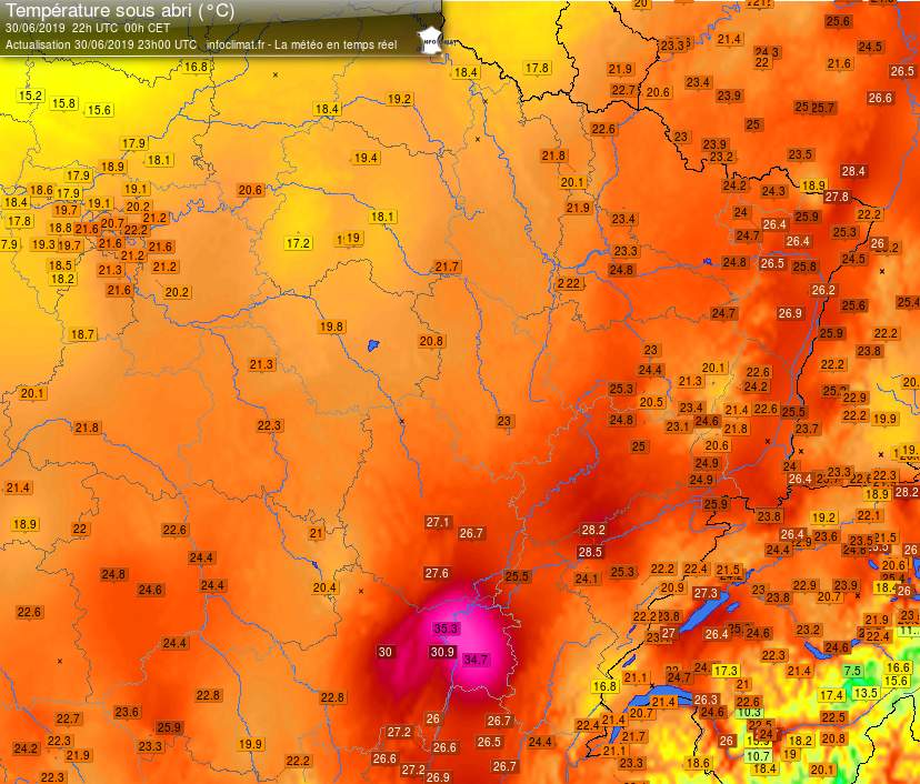 Les plus fortes valeurs, dépassant 35°C, sont les suivantes :