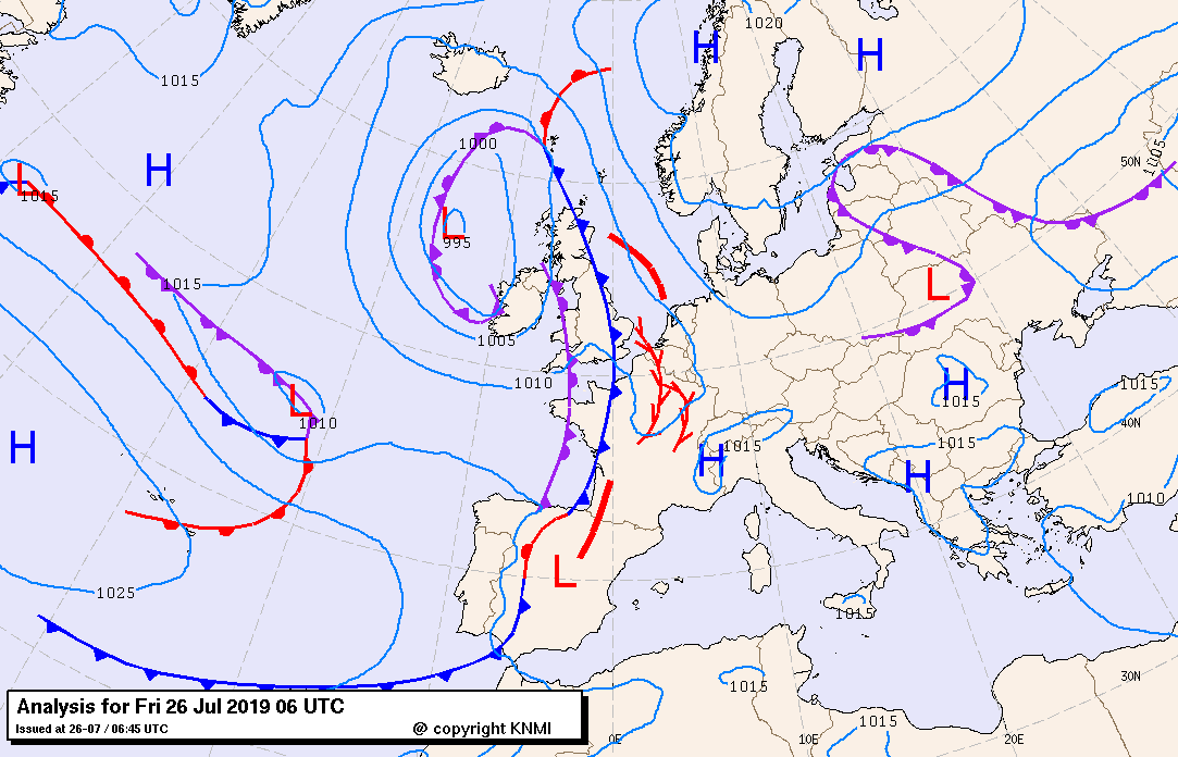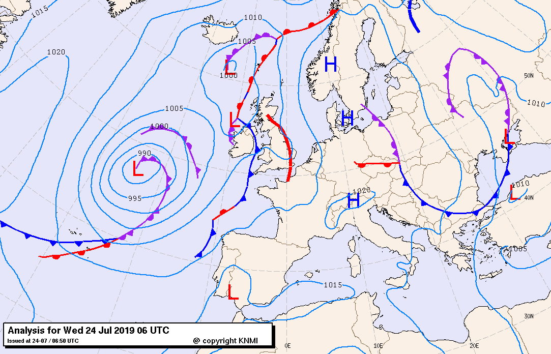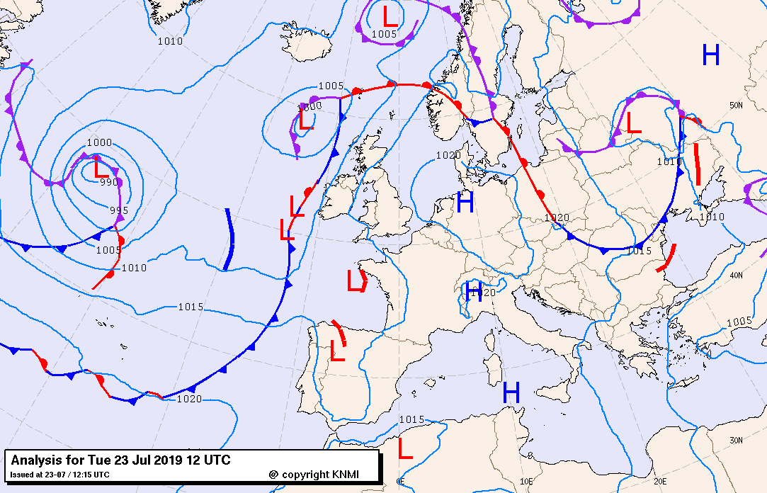 En fin juillet, la configuration barométrique de surface devient propice pour l’advection d’air très chaud même vers notre pays. Dès le 23 juillet, les pressions restent constamment hautes à l’est de nos régions, et basses à l’ouest de nos régions, avec des dépressions sur l’Océan et des centres de basse pression thermique, plus modestes, qui se forment souvent en bordure du continent.