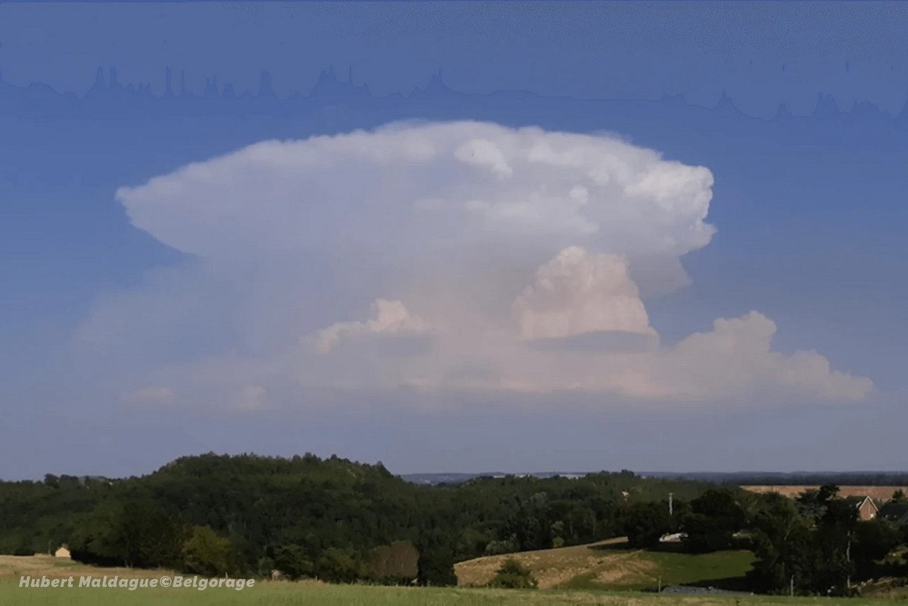 Les températures de 8 heures annoncent déjà la couleur, avec souvent 24 à 26°C, voire 27°C par endroit. Ensuite, le soleil de plomb fait le reste. Car le ciel est serein à peu nuageux, avec juste quelques bancs d’altocumulus, parfois de floccus et castellanus. Peu après midi, la convection s’enclenche sur l’est du pays, avec de l’activité orageuse dès le début de l’après-midi sur l’est des Hautes-Fagnes. Sur le centre du pays, les premiers cumulus se forment en milieu d’après-midi, avec de grandes disparités locales, développement rapide ou non en cumulus congestus et cumulonimbus.