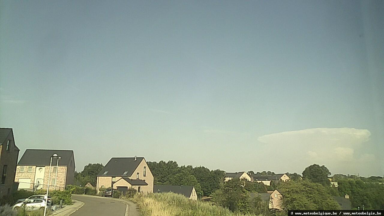 Cette cellule orageuse, en raison de la quasi-absence d’autres nuages, est visible de très loin. Ci-dessous, on la voit depuis Braine-l’Alleud, captée par le webcam de MétéoBelgique à 18h20.