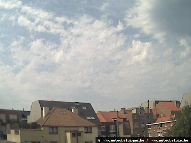 Là, le temps est bien rafraîchi, avec des températures le plus souvent proches de 23°C du côté ouest de la côte belge et de 24°C du côté est, et parfois encore quelques bouffées d’air un peu plus chaud. C’est ainsi que le maximum atteint 26,5 à Zeebruges et 25,1°C à Dunkerque, mais seulement 24,3°C à Middelkerke. Cette fraîcheur marine pénètre assez loin à l’intérieur des terres et est encore bien perceptible à Dixmude, Gistel et Bruges, où les maxima restent largement inférieurs à 30°C.Le ciel n’est pas très différent de celui du centre du pays, avec cirrus et altocumulus, souvent floccus et castellanus.