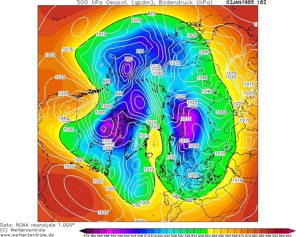 Exemple d'une situation de vortex polaire FAIBLE et éclaté (Split Event) (ici en début janvier 1985) : il reste concentré près du pôle et le courant jet est faible et ondulé, permettant à l'air froid d'atteindre nos régions : l'hiver 1984 - 1985 aura été un des plus froids des ces 50 dernières années.