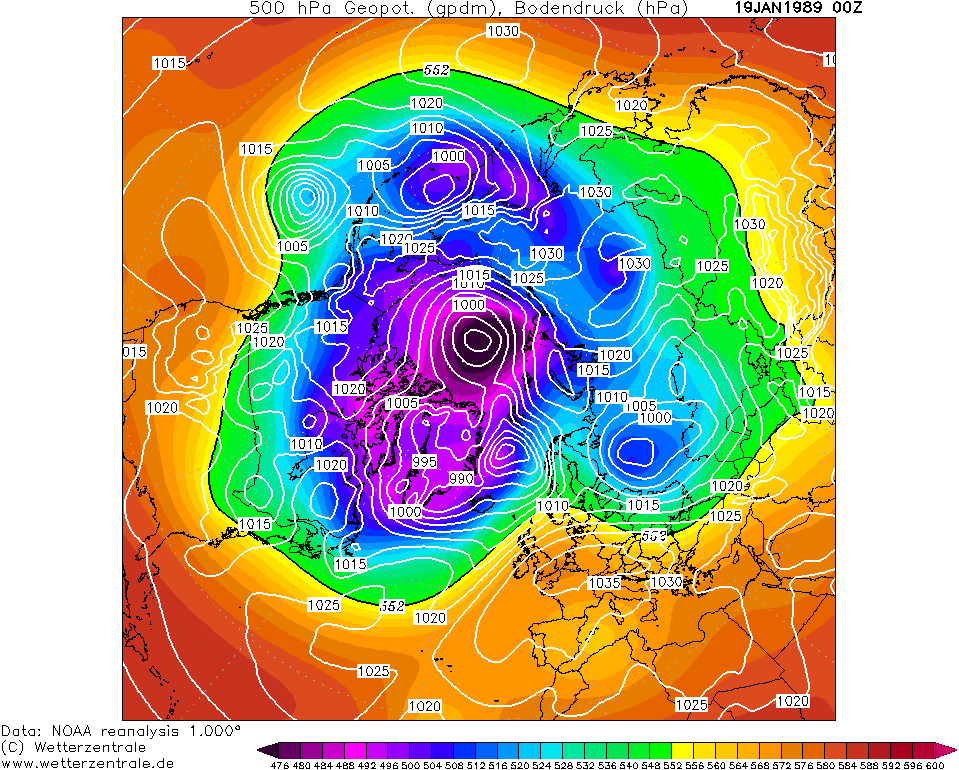 Exemple d'une situation de vortex polaire FORT (ici en fin janvier 1989) : il reste concentré près du pôle et le courant jet rectiligne est très puissant : l'hiver 1988-1989 aura été très doux sur l'Europe.