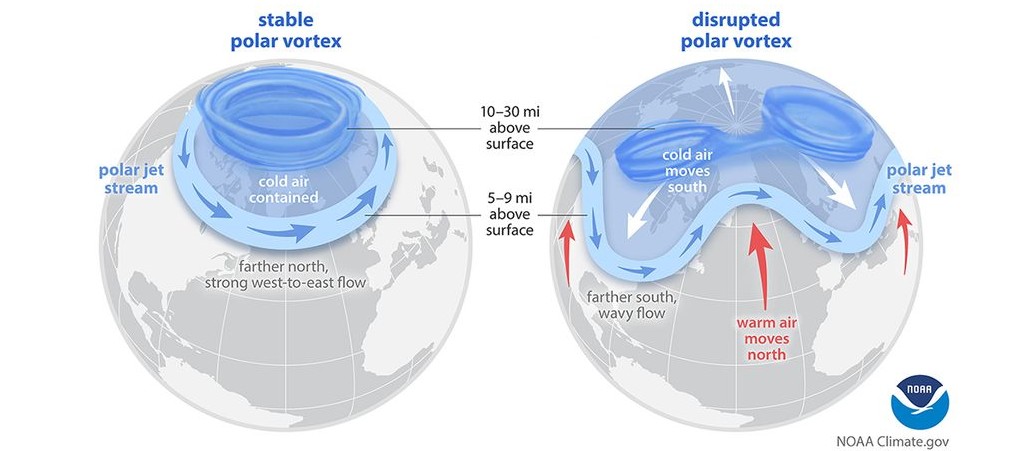 Lorsqu’elles atteignent la stratosphère, elles freinent le courant-jet du vortex jusqu’à l’inverser. Le vortex se désagrège, parfois en plusieurs morceaux, et les masses d’air froid descendent vers nos latitudes.