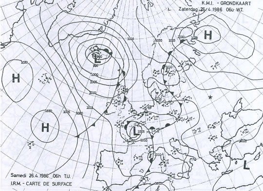 Du 26 avril au 6 mai donc, de grosses quantités de matières radioactives ont été relâchées dans l'atmosphère (essentiellement du Césium 137 (137Cs) et de l'Iode 131 (131I)). Ces matières se sont déplacées avec les masses d'air dans la troposphère, ce déplacement étant déterminé par les centres d'actions atmosphériques (dépressions et anticyclones). Le 26 avril (voir carte ci-dessous), un anticyclone est présent sur la région de Saint-Pétersbourg (Lenningrad à l'époque): les masses d'air de Tchernobyl se déplacent du SE vers le NO : cela explique que ce soit la Suède, premier pays occidental touché par la masse d'air qui a été touchée et qui a pu ainsi donner l'alerte.