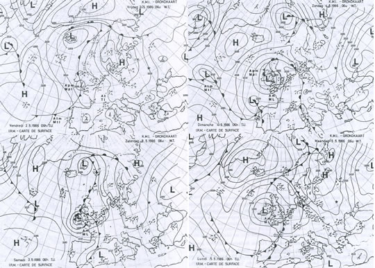 Cartes de surface des 2, 3 4 et 5 mai 1986. source : IRM