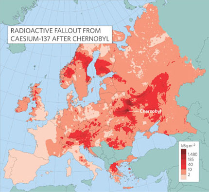 Sur base de ces précipitations et de la trajectoire du "nuage" radioactif, on a pu déterminer quelles étaient les régions en Europe les plus touchées par les retombées radioactives : elles vous sont présentées sur la carte ci-dessous.