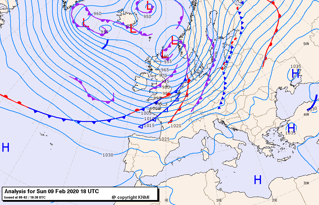 C'est une dépression très profonde qui a traversé l'Atlantique Nord et qui se trouvait en fin de journée du 9 février au nord des îles britanniques avec, en son centre, des pressions inférieures à 950 hPa qui est la cause de la tempête que nous avons connue. C'est au sud-ouest de ce noyau dépressionnaire, donc aussi sur nos régions, juste après le passage du front chaud (en rouge sur la carte) et au passage des fronts froids (en bleu) que les rafales les plus fortes ont été enregistrées sur notre pays.
