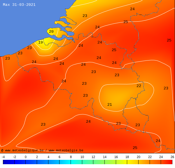En Belgique, le temps est très beau avec parfois quelques cirrus. Les températures, sans encore être exceptionnelles, atteignent déjà de belles valeurs, avec le plus souvent 19 à 21°C en plaine et autour de 18°C sur les hauteurs. La plus haute valeur est enregistrée à Koersel avec 22,2°C.