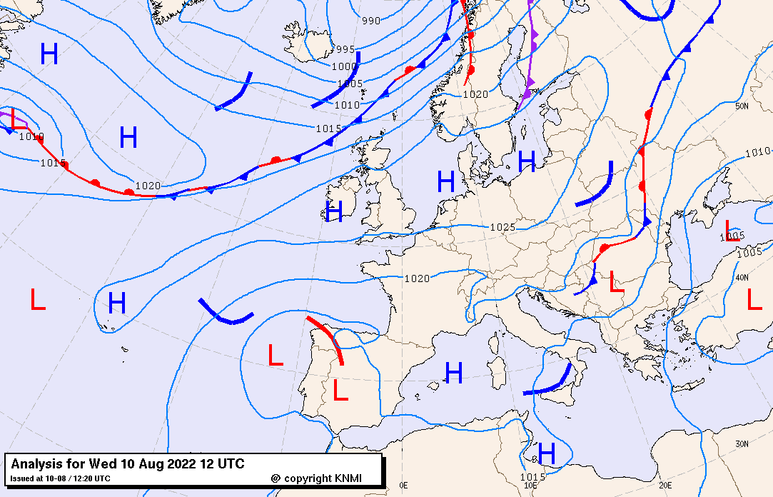 Une barrière anticyclonique s'étenendant des Açores jusqu'à la mer Baltique nous place dans des courants continentaux secs et chauds : une synoptique idéale pour une vague de chaleur modérée sur nos contrées.
