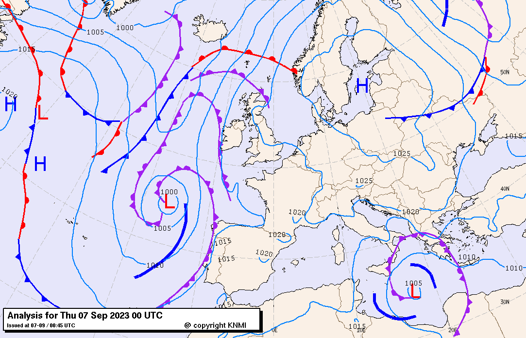 Si on regarde la carte synoptique ci-dessous, on observe un anticyclone sur la Scandinavie, ce dernier est stabilisé par deux dépressions sur le sud de l'Europe : la première au large de la péninsule ibérique, la seconde proche de la Grèce. Ce type de synoptique donne ce que l'on appelle une structure en oméga en analogie à la forme de la dernière lettre de l'alphabet grec. Ce type de synoptique, typique des grosses vagues de chaleurs estivales, donne une stabilité au système et permet l'aspiration et la remontée de l'air tropical sur nos régions; air tropical assez humide cette année en se chargeant d'humidité en passant sur la Méditerranée, dont les eaux de surface sont très chaudes. La stabilité des deux dépressions auront eu quant à elles des conséquences sur les régions situées en dessous de celles-ci avec un temps perturbé et très pluvieux : les inondations en Grèce, puis en Lybie consécutives au caractère très peu mobile de ces dépressions auront été catastrophiques.