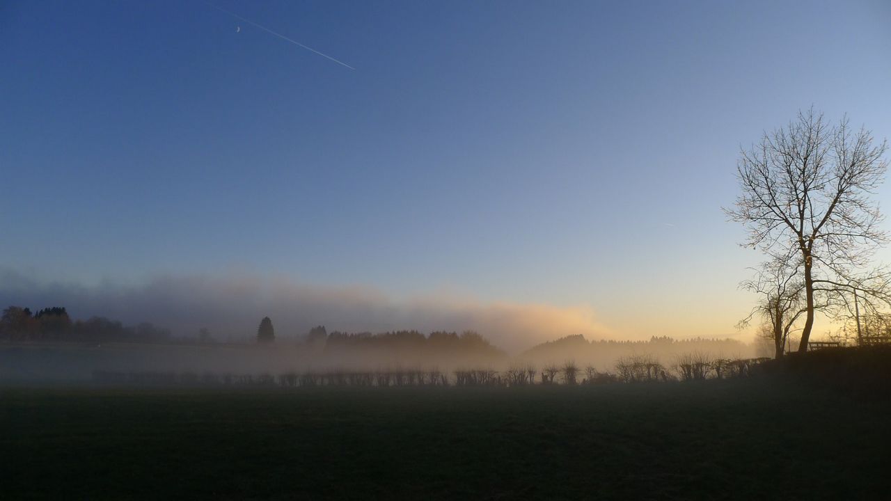 L'aube se lève le 1er janvier 2020 sur Xhoffraix, avec une zone d'inversion vers les 500 m d'altitude : brouillards en dessous, soleil serein au dessus.