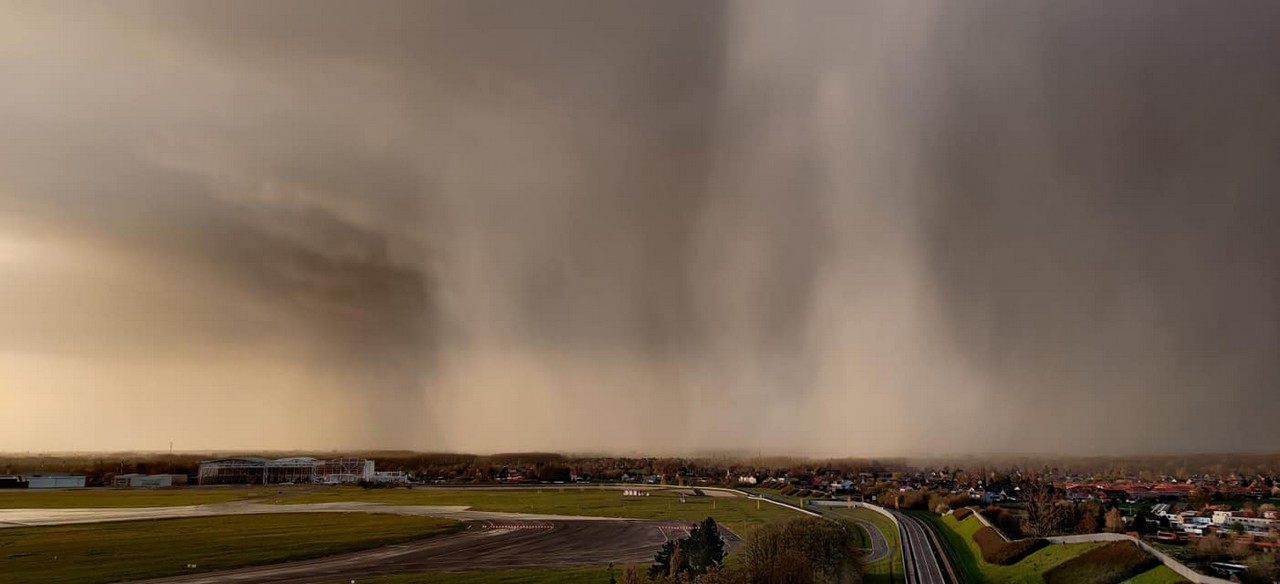 Arrivée d'un véritable rideau de neige, vu depuis l'aéroport de Zaventem (Bruxelles-National) le 6 avril 2021.