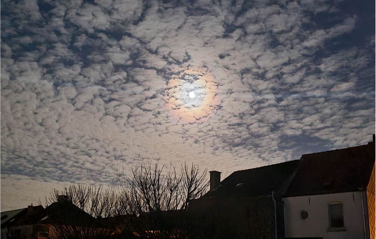 Diffraction de lumière de la lune dans les bancs d'altocumulus, à Opwijk le 5 avril 2023.