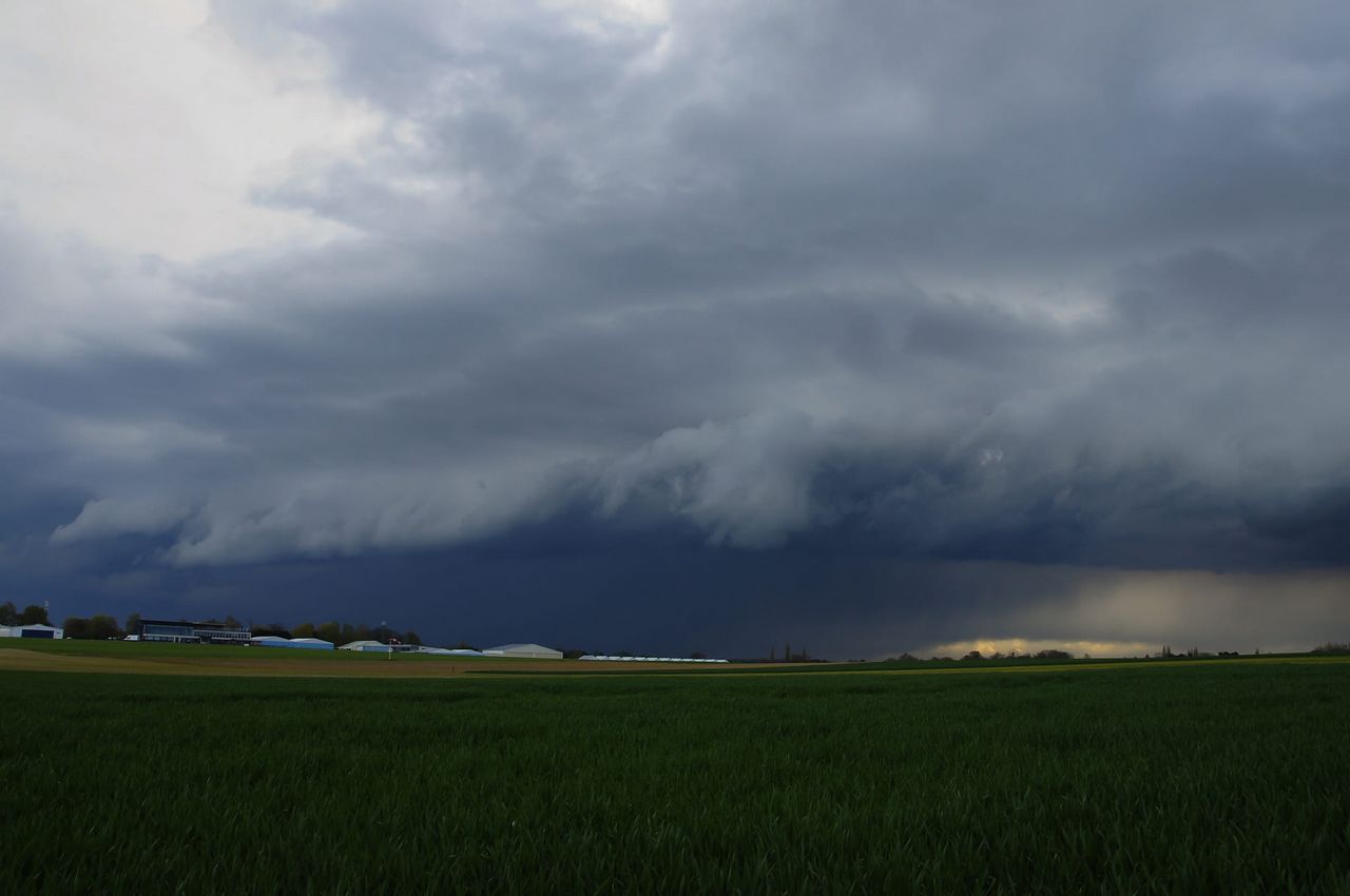 Beau cumulonimbus blanc derrière quelques fractocumulus gris dans le ciel de Jemeppe-sur-Meuse, ce 21 avril 2023.