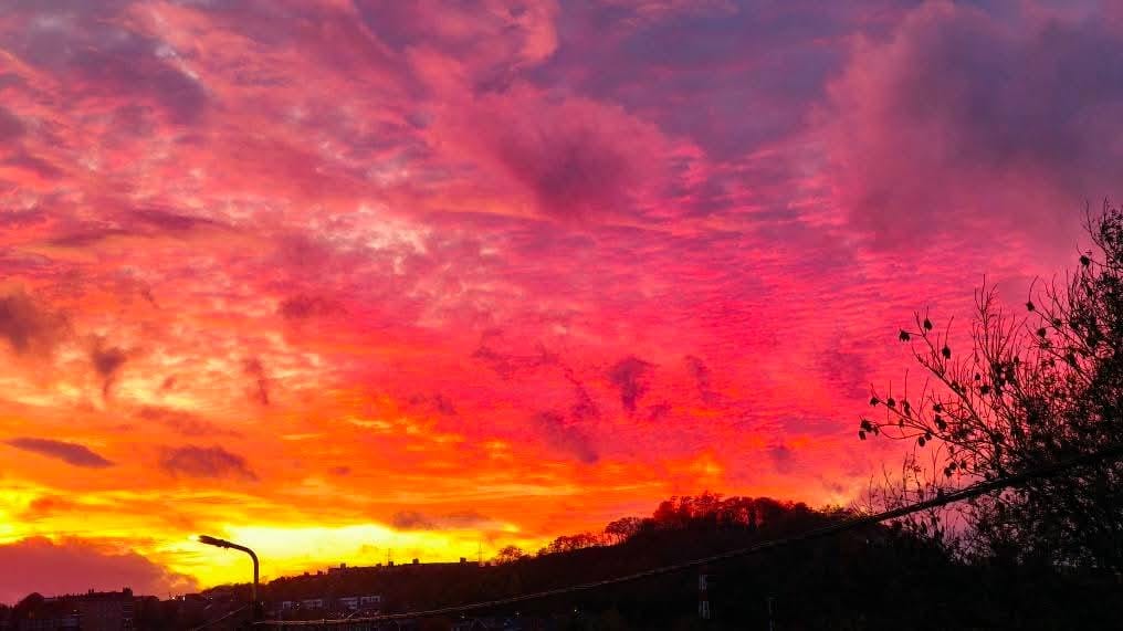 Ciel rougeoyant au coucher du soleil, à Jemeppe-sur-Meuse, le 28 octobre 2025.