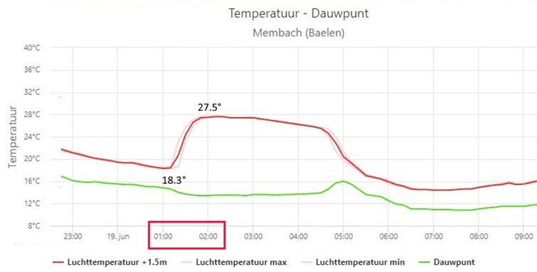 Les phénomènes chauds, au contraire, sont de brusques remontées de la température en plein milieu de la nuit, alors que le début de la nuit a éventuellement été déjà frais. Par exemple la nuit du 18 au 19 juin 2022, la station de Membach, près d’Eupen, enregistre 18,3°C à 1 heure du matin, puis 27,5°C à 2 heures !