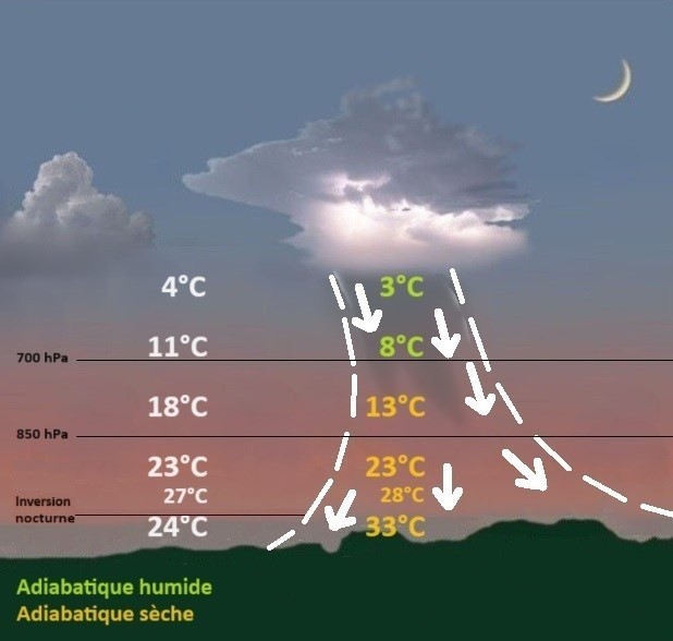 Nous avons donc, dans un premier temps, de l’air froid entraîné vers le bas par l’averse, comme dans n’importe quel orage. Cet air, en raison de l’intense évaporation des précipitations dans l’air sec, devient nettement plus froid que l’air environnant, ce qui accélère encore sa chute. Seulement, une fois l’averse évaporée, l’air passe de l’adiabatique humide à l’adiabatique sèche et se réchauffe dans sa chute de 1°C par 100 mètres. Pour finir, cet air devient alors plus chaud que l’air environnant. Cependant, par inertie, l’air continue sa chute pendant un certain temps encore et atteint parfois le sol. Dans ce cas, classiquement, cet air est de 7 à 8°C plus chaud que l’air environnant mais, dans les cas extrêmes, peut devenir plus chaud de plus de 10°C.