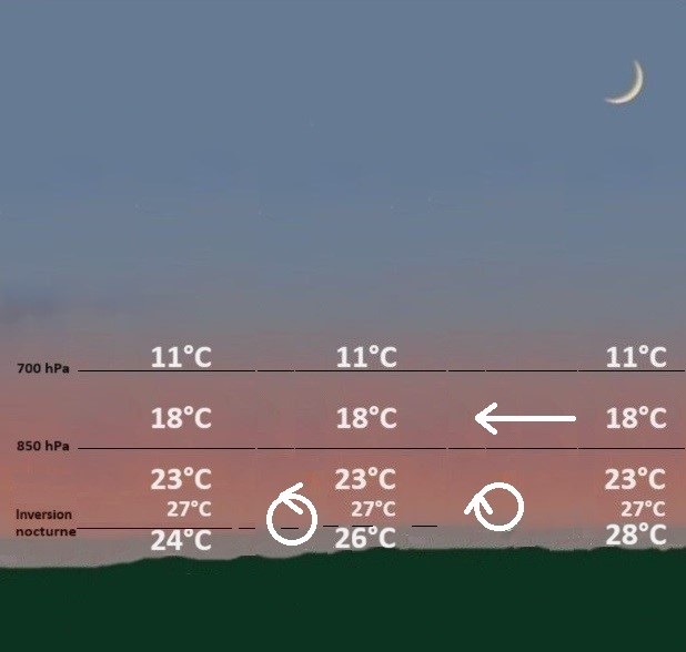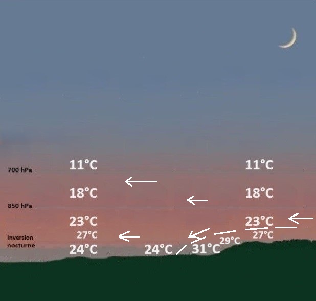 Nous sommes ici dans un cas d’advection d’air très chaud, avec des températures qui ont déjà été très élevées en journée. Mais, dans un premier temps, le mouvement de l’air est encore insuffisant pour empêcher le refroidissement nocturne de l’air au contact du sol froid.